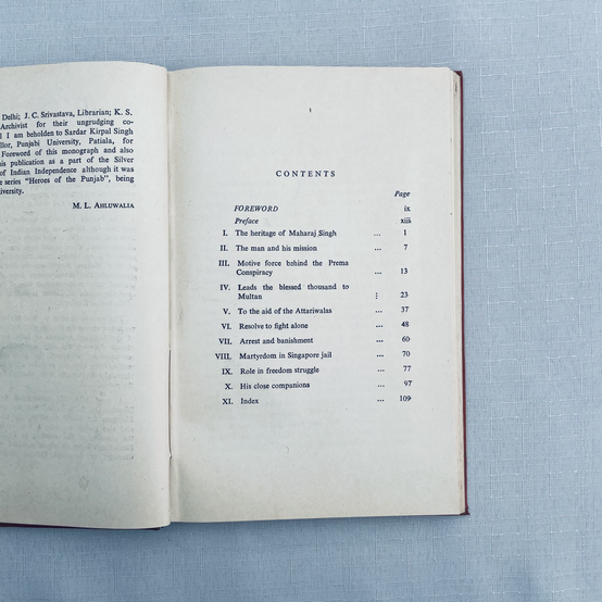 The legacy of Bhai Maharaj Singh is one that shaped the socio-political landscape of the Punjab during its annexation by the British in the mid 1800s. Yet there is little work published to solely reflect his life and character. To that, M. L. Ahluwalia’s work is one that provides great insight and understanding into what Bhai Maharaj Singh represented and the impact he had on the Sikh panth. This particular copy is a first edition, published in 1972 by Punjab University Patiala.